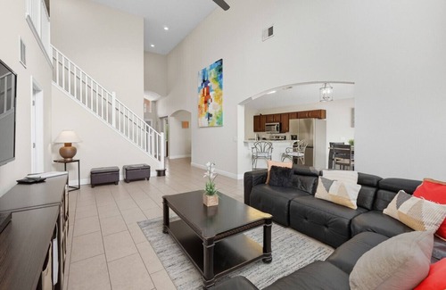 Step into a light-filled open living space where the whole family can gather. The living room features plush seating and a smart TV, perfect for movie nights after a day in the parks. The kitchen is a dream for home-cooked meals with modern appliances, breakfast bar, and a cozy nook for morning coffee. A spacious dining area brings everyone together for shared meals and laughter.