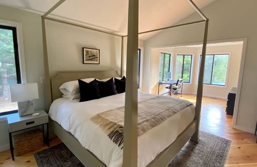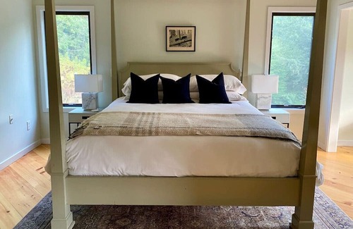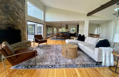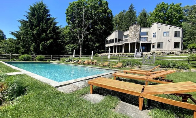 Escape to our spacious midcentury home set against a park in the charming town of Redding. Enjoy the luxury of a private heated pool open from Memorial Day to Sept 30th (heated through Labor Day), or snug up in front of a fire in the great room with unbelievable forest views as your backdrop in the winter. Our five-bedroom house is the perfect retreat for large families or groups of friends looking to relax and explore the area. The house is about an hour and a half drive from NYC.