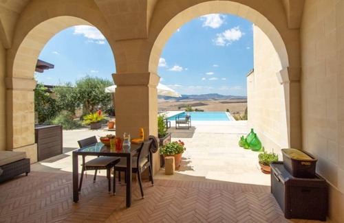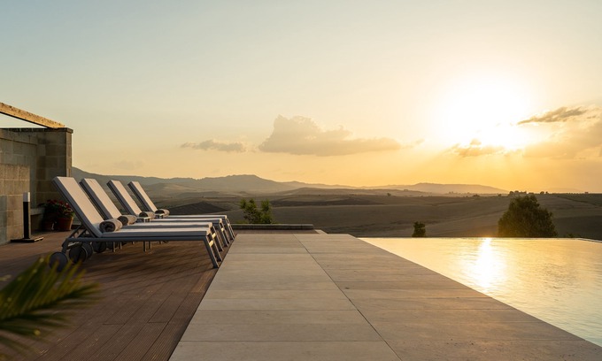 This 3 bedroom Villa sits commandingly on its own hilltop, surrounded by rolling hills of grain fields with breathtaking 360 degree views around a magnificent, heated infinity pool. The well-proportioned rooms are laid out over a single story all with marble floors, impressive vaulted ceilings with Pugliese yellow stone and French doors opening onto a stunning pool deck, stone loggias & expansive terraces. The bathrooms feature Philippe Stark and Grohe fittings and large walk in showers while the chef's kitchen features LadyCucine custom cabinets & Siemens appliances. You'll be dazzled by the sunsets over the infinity edge pool each evening. Just 14km to the Historic Center of Matera where you can visit Michelin rated restaurants and 5 Start Hotels or old school Trattoria's set inside the classic caves. Take a beautiful 30 minute drive to the unique sandy Ionian beaches and stop by or visit all of the charming towns of Puglia like Alberobello, Ostuni & Monopoli within an hour's drive. Bari airport is less than an hour's drive.