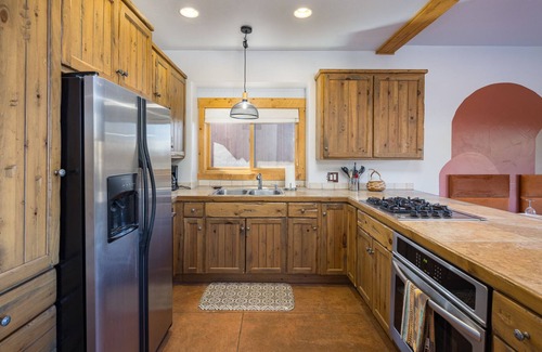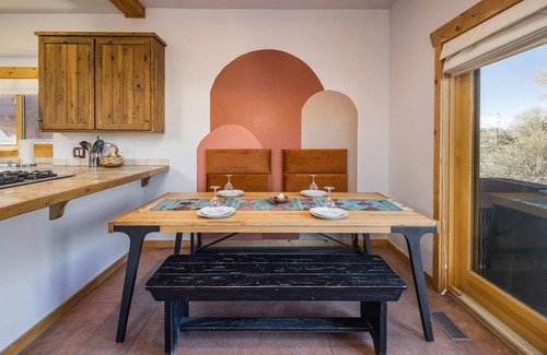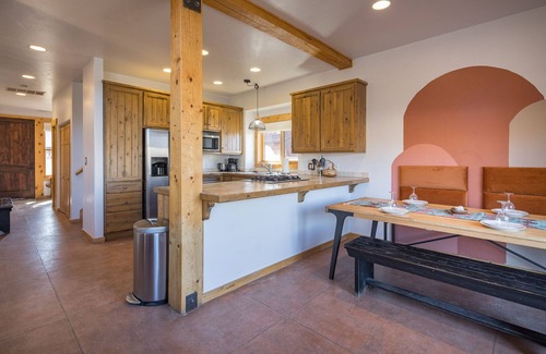 The open-concept living space is ideal for gathering and planning your Moab explorations. In cooler months, cozy up with a glass of wine by the gas fireplace and share stories of the day’s adventures. Stream your favorite shows on the flat-screen TV or set the mood with music on the Sonos system. Downtown Moab, with its excellent dining and vibrant local culture, is just a quick 5-minute drive from the house!
