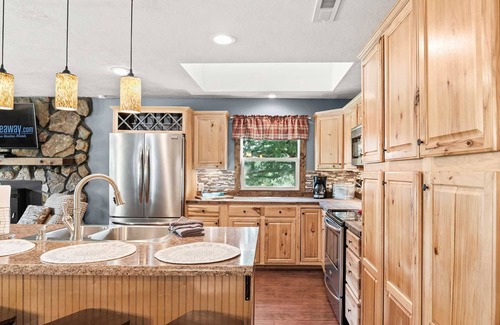 Hideaway Resort is located on the James River arm of Table Rock Lake between points 11 and 12. Although the resort is not located in Branson, you are just a 35 minute drive away from everything the area has to offer. The first thing you will love about this property is the large open living room, kitchen, and dining room area. This will set the stage for dinners, game nights, and memories that will last for years to come. The living room has plenty of seating for all. A favorite is the luxury electric dual leather recliner! You will want to nap here. The living room also has a new smart TV with satelite, so you don't have to miss your favorites while at the lake. The kitchen has updated appliances and truly everything you need to prepare your favorite meals and serve everyone in the lodge. In addition to the large dining room table that seats eight, the breakfast bar also seats six, and there is a gaming tablein the living area that seats four.