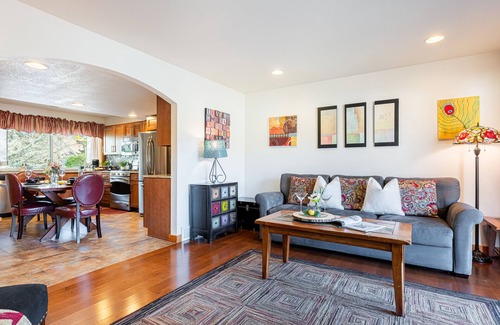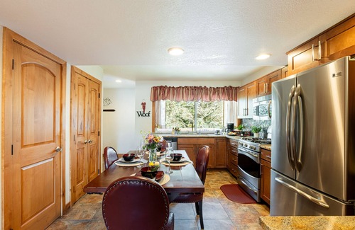 Kitchen and Dining Area: The remodeled modern kitchen features stone countertops, stainless steel appliances, and a gas range, making it a dream for any chef. It's fully equipped with all the essentials, including a drip coffee maker. The wood dining table seats up to 10, with table leaves and extra chairs for additional seating.