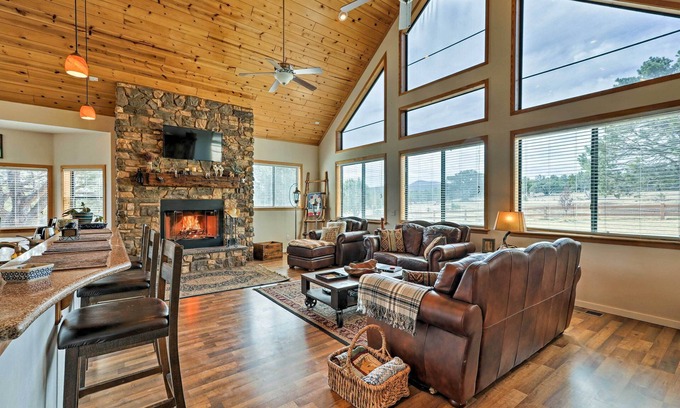 Plan your next Arizona retreat to this stunning 3-bedroom, 3-bath vacation rental in Vernon! Ride horses through the Apache-Sitgreaves National Forest, canoe on Fool Hollow Lake, or just relax in the open great room and gaze out at the beautiful views. Featuring a game room with a pool table and dartboard, a stone fireplace, and a grill, this spacious cabin is ideal for family gatherings!