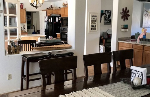 Beautiful home decorated in a western theme, in a clean and friendly neighborhood. . Located on a large corner lot with a huge back yard filled with palm trees, cactus's, citrus trees humming birds, bunnies and morning quails. ( even some Arizona grass). Patio table seats 6 with over head gazebo lighting. Misters along the back porch, Gas BBQ, propane fire pit and wood burning fire pit with extra chairs, benches and ponchos ( for those chilly nights). Horse shoe pit and cornhole.. "BRAND NEW PRIVATE POOL AND HOT TUB" Dining room seats 8 and breakfast pub seats 2. -+ 4 bar stools. Kitchen is fully equipped with all appliances including juicer, toaster, blender, crock pot, indoor grill, air fryer, coffee pot and keurig machine. Full size washer and dryer. Master bedroom has a king bed. Master bath has double sinks, separate bath tub & shower and a private toilet with a large walk in closet. 2nd bedroom has a queen bed and a queen murphy bed. All mattresses are new and super comfortable... Great stock of extra bedding, bath towels and beach towels for the pool. 2 car garage with an extra full size fridge. We have also included a gas golf cart & 2 mountain bikes (including helmets) for riding around the village. Other misc. items: iron & ironing board, hair dryer, pack and play (baby/toddler bed), high chair. Also included: is a welcoming basket and a case of chilled water... Laundry soap, fabric softener & dryer sheets, dish soap, bar soap, shampoo & conditioner, Paper towels/napkins. Kitchen pantry is full of seasonings, sugar, flour, oil etc.