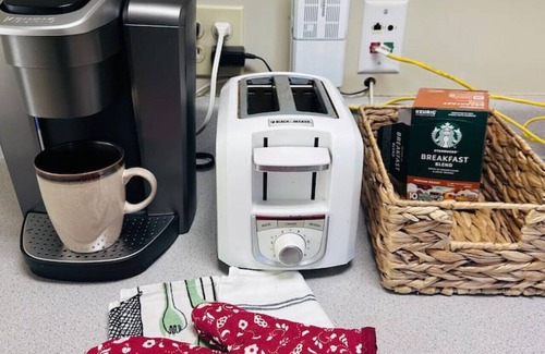 Fully stocked kitchenette with essentials such as air fryer, microwave, conventional oven, refrigerator, coffe maker, toaster