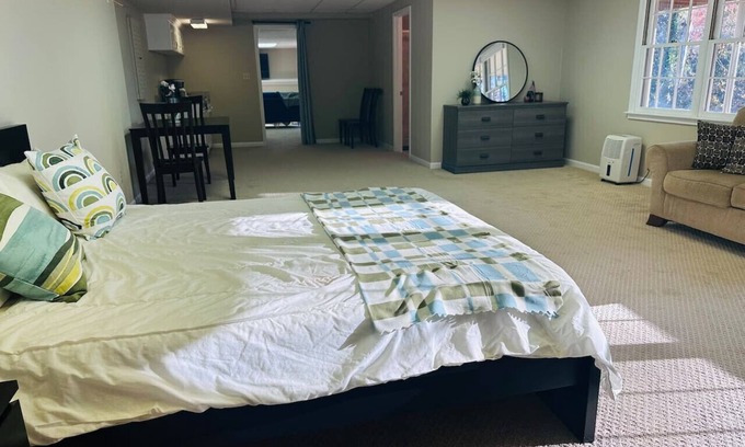 Massive, private walk out basement unit with private/separate entrance, private bedroom with attached bathroom, living room with smart TV, kitchenette. The unit is very spacious and comfortable with tons of natural light from huge glass windows and door. Walk out to the private backyard and patio to enjoy the natural beauty. The property is located in the heart of East Cobb and is only a few minutes from grocery stores, restaurants, cafes, cinema, shopping areas, walking/hiking/biking trails.