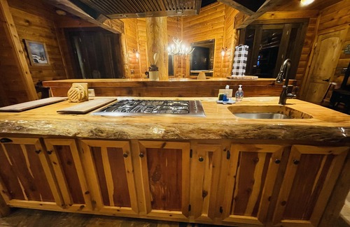 At the bottom level of Mystic Lodge, you will find “Mystic River Tavern”, an entertainer's dream. This expansive tavern has a full bar area complete with a custom exotic built 360 wooden bars complete with stools, two kegerators (Guests are responsible for providing kegs and CO2, there are local vendors that sell kegs-ask for more details upon booking), storage cabinets, a mini refrigerator, bar ware and 2 overhead TV’s.