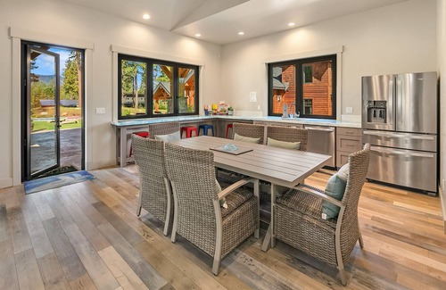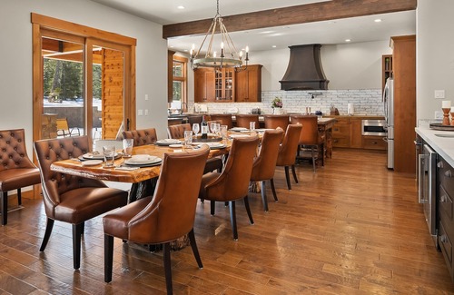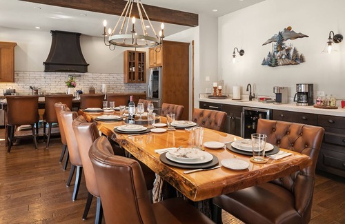 The fully stocked kitchen is ready to provide you everything you will need for fantastic family dinners or feeding a large group. It boasts stainless steel appliances, custom cement countertops, dual sinks, and an oversized island prep area that seats 4. The massive dining table is just steps away and can seat 10 comfortably.
