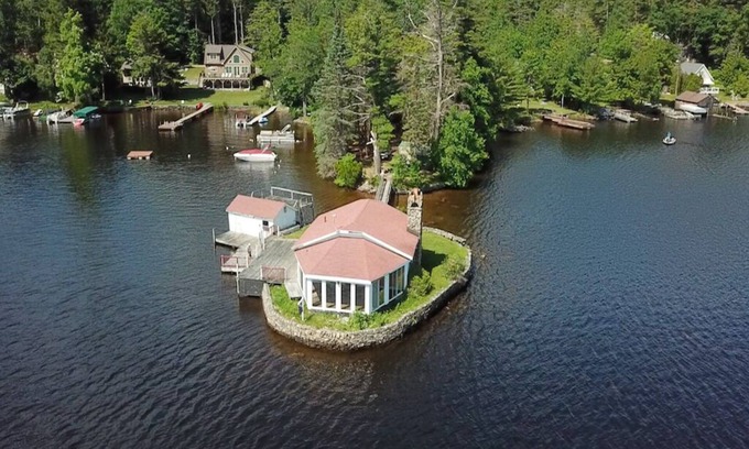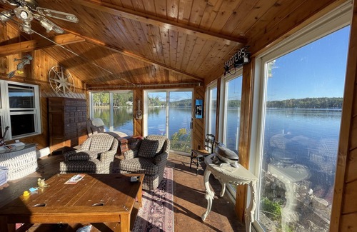 Rustic.. Not fancy... It's a cabin... 2 bedroom, one with a Queen the other with twin bunkbeds... 2 couches could sleep extras. One bathroom. Very relaxing! Great place to chill on the deck with friends and family! Completely surrounded by water and Chain Pickerel, Crappie, Sunfish, White Perch, Yellow Perch, Brook Trout, and Tiger Trout are the fish you will catch if you are into fishing! Otherwise, just relax, enjoy the water activities, and movement on the lake. 24' Pontoon boat is available.