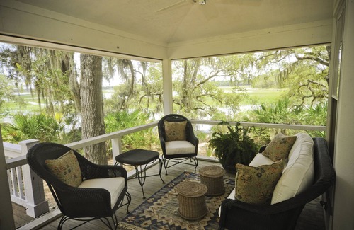 Located on a private island within the gates of the Colleton River Club*, this cottage sits on one of the prettiest, most unique sites in the Hilton Head area. The 'Devil's Elbow Cottage' is nestled among ancient Live Oak trees overlooking the marshes and waters of the Pinckney Island Wildlife Refuge.