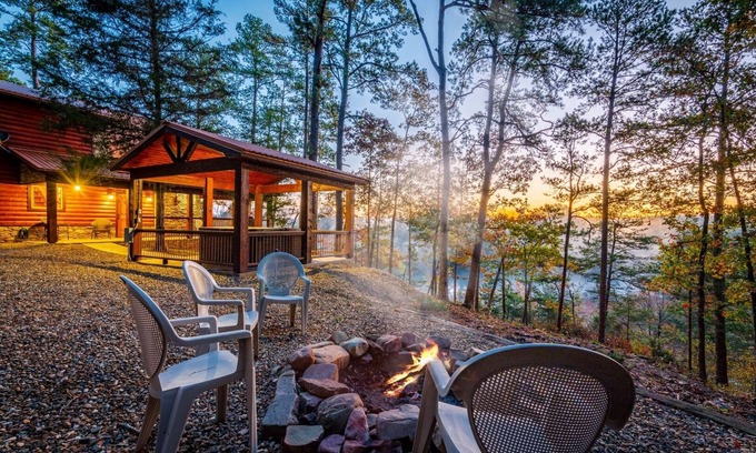 Step outside to the back covered patio, where you can take in panoramic views of the river and enjoy breathtaking sunsets. The patio offers outdoor dining, ample seating, and a gas grill (propane provided) for evening cookouts. The private hot tub cabana provides a relaxing retreat with the same picturesque river views. To the side of the cabin, a fire pit area surrounded by towering pine trees offers the perfect setting for s'mores and storytelling under the stars.