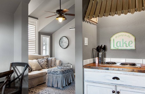 Charming guest cottage on beautiful Lake Granbury! This newly constructed guest suite is lake front, on the most beautiful open water area of Lake Granbury and close to the Granbury Historic square. There are several steps to walk up to access the cottage, and is perfect for a couple with one bedroom (queen-size bed), but there is a large couch for an extra guest. There are ceiling fans in each room, and separate thermostats. Upon arrival guest are impressed with the immaculate interior of the cottage, with a kitchen, living room, and bedroom with private bath. Enjoy a great weekend at the lake and enjoy the fishing and scenery from the dock. (There is a resource for renting boats, jet-skis, and all kinds of water-sport equipment only blocks away.) The guest suite has a beautiful, serene view of the water, with plenty of outdoor seating to relax and enjoy. It's perfect for a romantic getaway, friends spending time together, or a relaxing overnight stay. Dine on site in the fully equipped kitchen or use the outside BBQ. Some prefer to experience Granbury’s fine restaurants, just minutes away. There is an outdoor fireplace and beautiful decks to enjoy the view of the lake. Curl up inside on the over sized sofa and enjoy watching your favorite sports on the 42'' flat screen set up for streaming your favorite channels and stay connected with our complimentary WiFi system. The guest suite is close to the Granbury Historic square and all the restaurants, quaint shops, local activities, and the beach! If guests need a break from the lake, there is plenty of entertainment around town. There is a newly renovated bowling alley and a cinema. There's even a drive-in movie in Granbury! On the historical Granbury Square there is always a play to be seen at the famous "Opera House." The guest suite is only 30 minutes from Fort Worth, or if you are interested in wildlife adventure, "Fossill Rim" is just a short drive away in Glen Rose, and "Dinosaur Valley State Park."