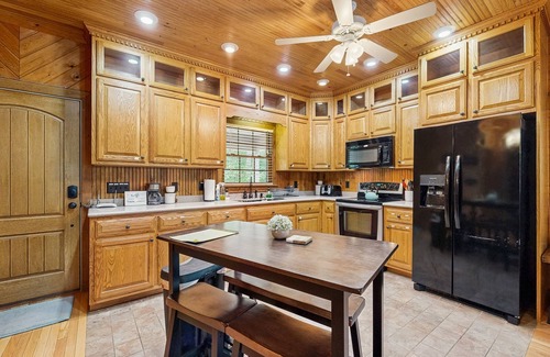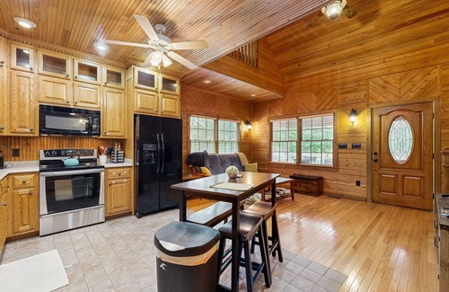 The interior of the cabin is just as charming with its high ceilings, unique wood finishes, and modern amenities. As soon as you walk inside, you will take notice of the living room's comfortable sofa, board game collection, and smart TV. The adjacent kitchen is well-stocked for all of your cooking sessions, displaying stainless steel appliances and an eat-in table.