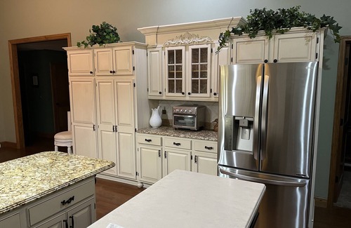 Welcome to the Eagle’s Nest Inn. This rare, large and private lakefront home sits on 1 acre and is surrounded by beautiful towering blue spruce on crystal clear Clifford Lake. Clifford lake is one of the most quiet and serene lakes in Michigan. The home is located 45 minutes northeast of Grand Rapids between Greenville and Stanton Michigan. Come and enjoy the sun-soaked days on the lake while swimming, fishing, water skiing, tubing, boating or just relaxing in nature. Keep an eye out for the majestic bald eagle soaring overhead! We also have a pontoon available for an additional charge waiting for you at the dock or you can bring your own boat. This home boasts a lovely, manicured yard with a large 24-foot round above ground swimming pool, a sun deck, a covered deck and lower patio area for dining all overlooking the pristine 200-acre all-sports Clifford Lake. The home is also equipped with a whole home generator, so no vacation time will be lost if power is interrupted. There is also a play area and swing set for children and adults too who love to swing! On the street side of the home there is a top-of-the-line adjustable height basketball hoop for half-court basketball games and a ping pong table in the garage. Near the water's edge you’ll find a covered pavilion to enjoy the beach and the boats passing by. Relax the days away under the pavilion in the shade or down on the beach soaking up some rays and getting lost in that book you’ve been wanting to read while you enjoy the cool lake breeze. The evening is a great time to enjoy the bright stars and a crackling fire as you roast some marshmallows and tell ghost stories or simply reminisce about days gone by. The property has a beautiful stone fire pit patio area Just below the deck. Campfire wood is provided at no additional charge. Clifford Lake is known for its crystal-clear water and its historic Clifford Inn Lake front restaurant. Also, it is one of the few lakes in Michigan that allows sea planes to land and take off. If you have a sea plane there is plenty of room at the dock! The Clifford Inn Restaurant was built in 1881. It has been officially declared as haunted and is said to be home to 2 ghosts. Megan, a teenage ghost who is afraid of people, so she spends most of her time in the attic and Edward who loves and enjoys the many people who visit. Megan and Edward are always on their best behavior and are very friendly to all. You can drive or boat over and dock right at the restaurant and enjoy a wonderful meal and/or cocktails on their grand lakeside deck or inside in the dining room or bar area while enjoying the rustic cottage-like atmosphere. The pork chop meal is fantastic! The Clifford Inn also has weekly entertainment check out their facebook page for shows and times. During rainy or colder seasons, there is plenty of room inside the home to spread out to play games, talk or watch a movie. There is a TV in every bedroom living and family room as well as wi-fi fiber internet throughout the home. On the lower level we have a Bose sound system with surround sound for an at home theater experience. Also enjoy preparing gourmet meals in the gorgeous kitchen, relax in the warm spacious living room or the very roomy lower-level family room with a fireplace and exercise area. This home is a great place for large families who enjoy re-connecting and making memories to last a lifetime.