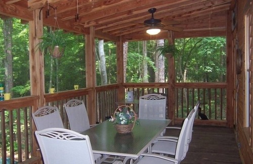 Starting from the ground up, there is stacked-stone foundation, chimney, & fireplace; then 3' X 9' floor joists for the 1st floor (exceeds any building codes, so the house is solid as a rock). The downstairs has custom-milled beams & includes bedroom (king), bathroom with shower, stack washer/dryer, fully-equipped kitchen, indoor seating for 10 with dining room table (6) & game table(4), hi-speed internet, & family room with satellite color TV, oversized fireplace, & sturdy antique staircase built in 1820. Opening from both family room and downstairs bedroom is a 10' x 20' aromatic cedar screened porch with ceiling fans and dining table for 6. This is our favorite spot for morning coffee, evening cocktails, and dining.