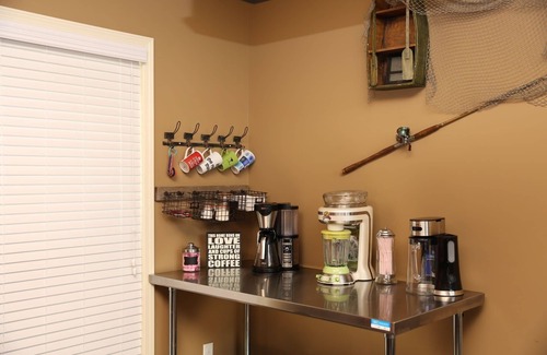 There is a separate stainless steel bar area with a Keurig, coffee maker offee bar and Margaritaville Mixer for your beverage preparation. You will also find an assortment of coffee, creamer and flavors for your beverages as well. The living space comes complete with a large sectional sofa, chaise lounge and window bench seating. Relax and enjoy a nice fire in the gas fireplace. Or, enjoy some quality family time by playing some games. An ample supply of board games are available for your use.