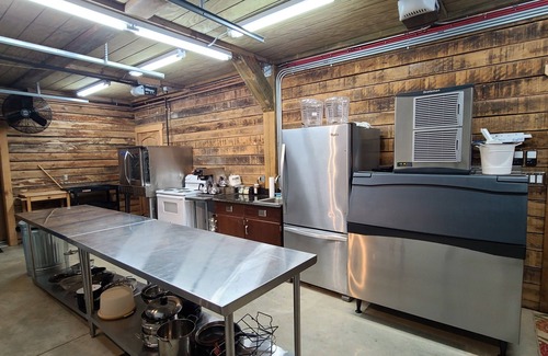 Inside the cabin, you will find the kitchenette on the main floor, complete with a microwave, coffee maker, crockpot, electric skillet, and more cooking appliances, along with a bathroom with a walk-in shower. For guests requiring a more comprehensive cooking experience, the caterer’s kitchen at The Stables is available to all overnight guests. The second level of the cabin is the living room/bedroom combo with a small balcony on the south side overlooking fields and a large balcony on the north side overlooking the lake. The overly large sofa pulls out to a king bed with a very comfortable mattress.