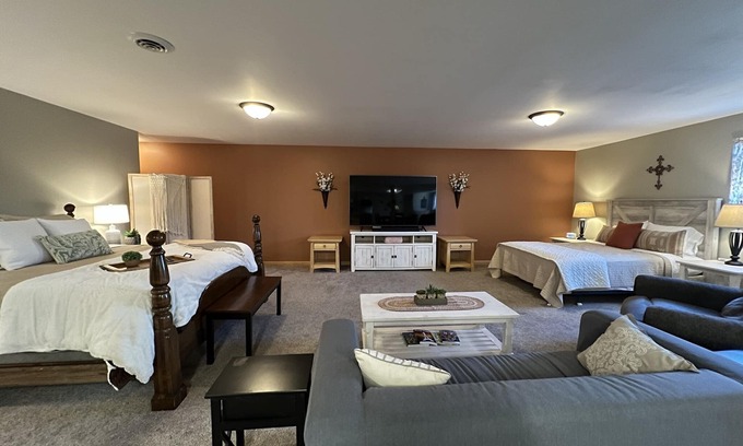 Large open suite with one king and one queen sized bed. Fully furnished kitchenette with dining area. A bathroom with shower is provided. Smoking/Vaping strictly PROHIBITED !