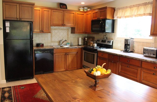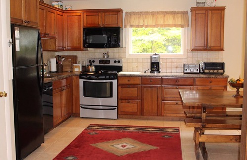 Our custom kitchen has cherry cabinetry, tile floor and is stocked with high quality pots, pans, dishes and service ware for 12 guests. Our guests will find that is easy to prepare everything from holiday meals to outdoor BBQ's. Coffee maker, 4 slice toaster, toaster oven, microwave, slow cooker, large electric fry pan, blender, Cuisinart food processor, electric mixer, roasting pans etc are provided as well as basic kitchen supplies. Basic supplies provided : spices, paper products (napkins, paper towels), cleaning supplies, dish soap, dish washer detergent, kitchen wraps, trash bags, coffee filters, sugar, flour, etc. We do not provide coffee.