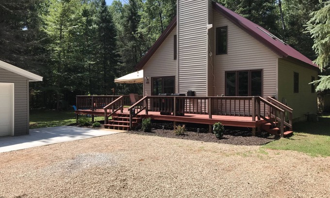 Our vacation home is near Boulder Lake(not on the lake). 1.5 acres on a heavily wooded lot provides privacy with lots of Wildlife wandering through the property. The home is 1000 Square feet with 2 bedrooms, 1 bath and a large loft. The home will accommodate 7 people in Beds. Satellite internet provides just enough bandwidth to stay current, flat screen TV's in the living room, master bedroom and loft. The loft TV has Wii so bring any games you may have. A very large deck wrapping half of the home, plenty of area to entertain and relax outside. Nice large fire pit for those cool nights, just sit back and relax and roast some marshmallows.