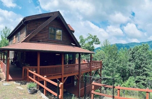 Relax with the whole family at this peaceful log cabin nestled on 10 acres wooded lot with stunning long mountain views in all directions. Upon entering the gated community, take a drive past 2 waterfalls and end at a private drive with no other houses in sight. Enjoy sunrises and sunsets upon the expansive 2 tier decks. Take a nap in the hammock under the trees , grill or use the smoker in the outdoor patio area. Fully stocked coffee bar. Bring your dogs for this trip, fenced yard.
