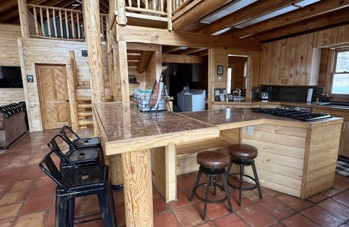 Follow the split log stairs to the finished basement were you will enter a large living space with couches, TV, game table and two sets of bunk beds. Attached is two private bedrooms with queen beds and TVs. On the other side of the stairs is a full bathroom and the SAUNA! There's plenty of space for everyone to unwind. Whether you're lounging in the cozy living area or enjoying a meal in the fully equipped kitchen, our cabin provides all the comforts of home. Make your holiday one for the books with a stay at Kevin's Cabin!