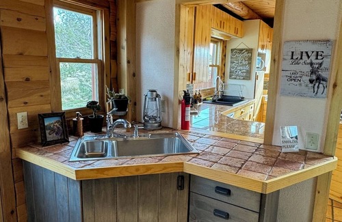Step inside and be greeted by cathedral ceilings, spacious living room (one queen sofa bed) large TV, wood stove fire place and large cabin style windows for viewing the beautiful countryside and wildlife. Also on the main floor is a fully stocked kitchen, dinning room, full bathroom and laundry room. Exit the kitchen to a fully fenced yard with wrap around deck, outdoor dinning, grill, horse shoes and the HOT TUB!