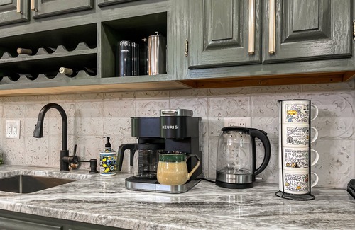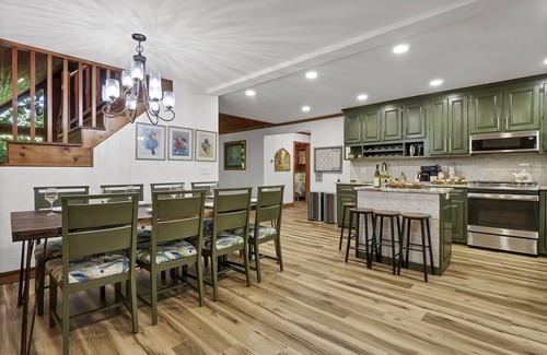 Fully Equipped Gourmet Kitchen: Prepare delicious meals in our expansive kitchen—equipped with two sinks, brand new stainless steel appliances (including a gas stove with built-in griddle), granite countertops, and our famous Pay-It-Forward pantry, often stocked with spices, essentials, and treats left by previous guests! The handmade 8’ black walnut river table seats your whole group comfortably.