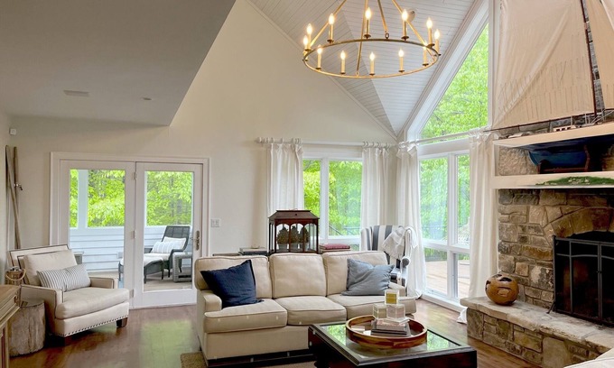 6,000 sq ft. Home on 5 wooded acres- privacy, luxury & best of Door County! Perfect 3 story house for your multi generation family reunions, friends or couples retreats. Only 2 min. drive (can bike) to both downtown Sister Bay & Ephraim. 1 block to shopping, restaurants, spa & mini golf. STARLINK Satelite WiFi. EV CHARGER IN GARAGE. Custom built for entertaining! 3 king Bedrooms, 2 on the 1st floor. 3rd floor haven for kids! Decorated with custom furniture & high-end plush mattresses. Relax in a casual yet sophisticated coastal style throughout this home which sleeps 10 comfortably. We strive to think of the details to make your stay unforgettable! House is fully stocked with dishes, crystal wine glasses, cookware, plush towels, fine bed linens, games, laundry detergent, etc… There are plenty of gathering areas yet room to find a quiet corner to curl up with a book. Upon arriving you will see the expansive lawn surrounding the house for lawn games, attached 2 car garage. AUTHENTIC restored Ephraim Viking settlers log cabin, perfect play house or teen hang out. Gourmet Kitchen: Suberzero, Thermador, Viking Appliances, Coffeemaker,Keurig, Toaster oven, Miele Dishwasher, Microwave, Stove/Oven, Blender. The main living is on the 2nd floor with gorgeous views of the woods, sunrise & sunsets. There are 2 living rooms; first a "great room" with a soaring fieldstone gas fireplace, vaulted ceiling and smart TV with access to the spacious screened-in porch and large wrap-around deck with outdoor fireplace, perfect for making s'mores. The 2nd living room is adjacent with a gas burning brick fireplace and a dining room table to seat 10. This living/dining room is open to a gourmet kitchen with bar seating for 4. 2nd deck is off the kitchen with more seating and a Weber Genesis 5 burner gas grill. Finished lower level features a 70' Home Theatre with surround sound, Blu Ray/DVD, large sectional queen sleeper sofa, full wet bar and a half bath. Smart TVs & Netflix. Ping Pong Table. Firepit in Yard. WiFi . Electrolux Washer/Dryer. 2 indoor Fireplaces (Gas) . NO SMOKING! NO PARTIES/EVENTS fills up so make your reservations early!