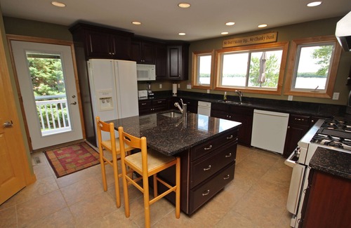 The main level boasts a professional gourmet kitchen (truly outfitted with everything you need), an open living/dining room with a dining table that sits 16, master bedroom suite, a second main-floor bedroom and bathroom, as well as an up-to-date laundry room. The massive windows and patio doors face the lake and welcome the outside in. Walk out the kitchen door for a gas grill and outside seating for a meal or before dinner appetizer.