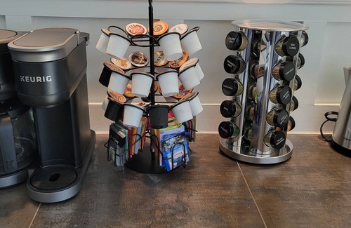 Sleek, fully equipped kitchen with stainless steel appliances, Keurig coffee station, and all the essentials for cooking at home.