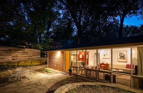 Come enjoy our super private, fully renovated "Mid-Century Modern Compound" in the charming and historic neighborhood of Hammond Wood, located just a short 5 mile drive from the Washington, DC border and one mile from the Wheaton Metro stop. Originally designed by renowned architect Charles Goodman (who also designed the iconic terminal building for the Washington National Airport), this 2-bedroom/1-bathroom home has been meticulously restored by Cook Architecture. The result is a comfortable balance of contemporary functionality and original design elements that pays homage to the home's significant history.