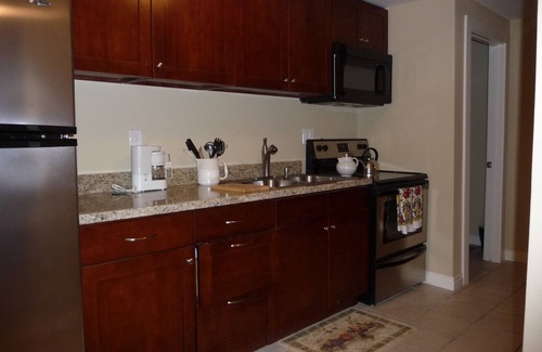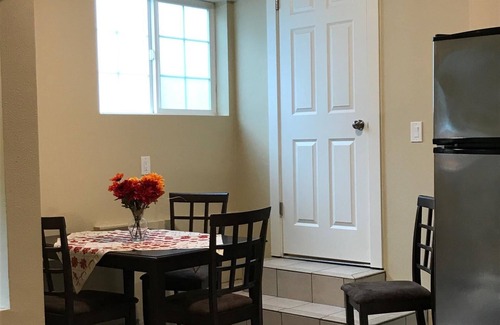 Private entrance with key code entry and interior deadbolt for extra security opens to large foyer, kitchen with granite counter tops, full bathroom with shower (no bathtub), living and dining areas, and laundry room (washer and dryer). Electric baseboard heating in each room. Private back yard patio through French doors is the perfect place to enjoy your hot coffee in the morning, or to finish off your day with a night cap in the evening. Use the high-speed internet wi-fi to stream your favorite internet-based shows; or get some work done if you're here on business.