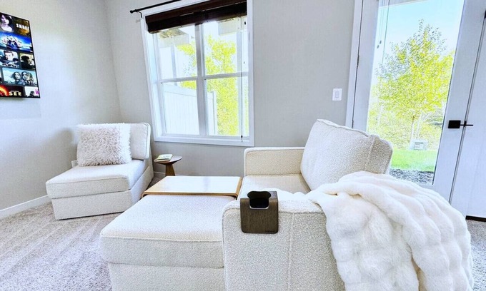 - Thoughtfully furnished with comfortable seating from Lovesac, and modern black matte finishes.