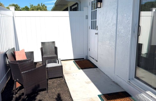 Step into a peaceful and modern retreat designed for both relaxation and convenience. The studio features a plush queen bed and a loveseat that converts into a pull-out bed, comfortably accommodating an additional adult or two small children. The kitchenette is thoughtfully stocked with essentials and includes an induction cooktop, air fryer, microwave, fridge, and coffee bar for both hot and iced coffee. A private patio with outdoor seating provides the perfect spot to enjoy your morning coffee or unwind after a day at the beach.