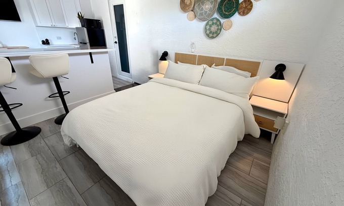 Step into a peaceful and modern retreat designed for both relaxation and convenience. The studio features a plush queen bed and a loveseat that converts into a pull-out bed, comfortably accommodating an additional adult or two small children. The kitchenette is thoughtfully stocked with essentials and includes an induction cooktop, air fryer, microwave, fridge, and coffee bar for both hot and iced coffee. A private patio with outdoor seating provides the perfect spot to enjoy your morning coffee or unwind after a day at the beach.