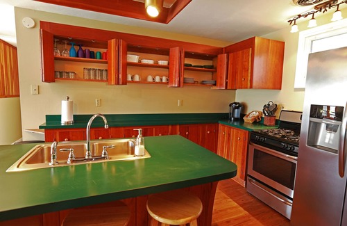 The kitchen is open to the dining room area and has a double sink, gas stove, refrigerator, dishwasher, microwave and coffee maker. The kitchen is stocked with silverwear, dishes, cooking utensils and pots & pans. All you need to worry about is your food.