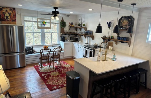 Fortunately, our property did not suffer damage during hurricane Helene and the surrounding town of Burnsville is bustling with dining, shopping and events in the Square. Completely remodeled 100-year old farmhouse tucked away on 50 acres of pristine Blue Ridge Mountain paradise. Hiking trails onsite with incredible views, multiple creeks to play in and a short hike to the South Toe River. Located only 20 minutes from the picturesque town of Burnsville this private retreat is centrally located to enjoy all the mountains have to offer whether you want to hike Mt Mitchell, sip wine at Biltmore Estate, float down the South Toe River or just curl up with a book on your secluded front porch bed. This cottage has an open floor plan with dining table for four and eat in kitchen with all new appliances and kitchen accessories. The living room has a fireplace and TV with pull out sofa. The master has a full closet and connects to the bathroom and mudroom with full laundry. The bunk room is perfect for children with four built-in beds with desk and tv. Come explore this private mountain retreat!