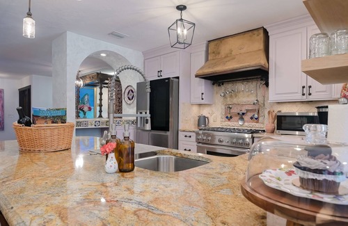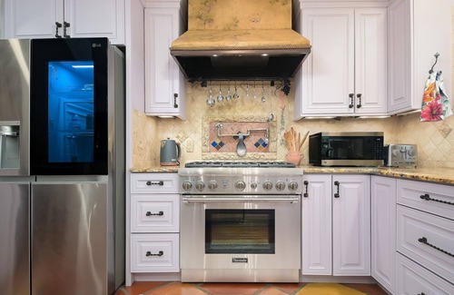 The Mediterranean-style gourmet kitchen is a chef’s dream, featuring an impressive Thermador gas stove. Gather on the expansive tropical patio, where hundreds of solar and string lights create a magical ambiance as the sun sets. Raise a glass of champagne under the stars, or take a short 12-minute drive to explore the beach and the charm of Fifth Avenue.