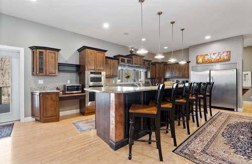 Ripple is a modern, spacious 5 bedroom, 4 bathroom home tucked away on private acreage in the storied 1000 North corridor of Hesston just south of the Michigan border. Perfectly positioned to enjoy all of the vast amenities that SW Michigan Harbor Country and NW Indiana have to offer. The primary suite has a king size bed, walk-in closet with laundry, a sitting area, and access to the expansive deck that overlooks the pond and the woods surrounding the house. The other four bedrooms offer beds for 2-4 people each and the entire home comfortably sleeps 14. Two fireplaces in the primary and living room on the upper level. Chef’s kitchen with cookware, combo drip coffee / k cup machine, and breakfast bar adjacent to the dining area. Lower level has a family room with a large sectional and a 75” TV as well as a smaller second kitchen and eating area. Sonos speakers throughout the home, Roku TVs and high speed internet. Linens and towels are provided.