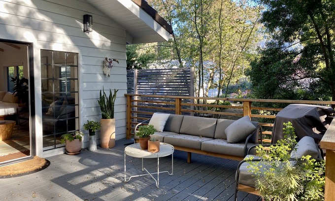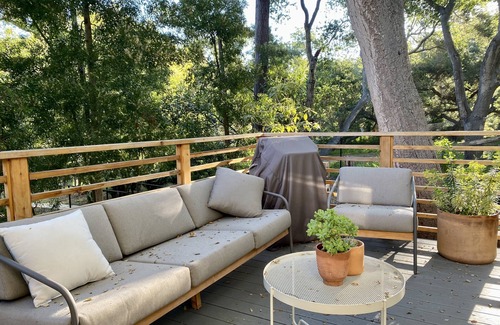 This private bungalow is set on 1.3 acres of lush oak and fruit trees in the heart of Montecito. The property is completely secure with a gate at the entrance and fence around the property. The gate is shared with the main house, however, there is a private driveway and bridge that leads to the guest bungalow. The guest cottage has a fully renovated kitchen, washer, and dryer, private deck with outdoor furniture and BBQ. King size Aireloom mattress and queen size American Leather pullout sofa. Enjoy a private deck with high end outdoor furniture and BBQ. Walking distance to LotusLand, and under 5 min drive to Butterfly and Miramar Beaches.