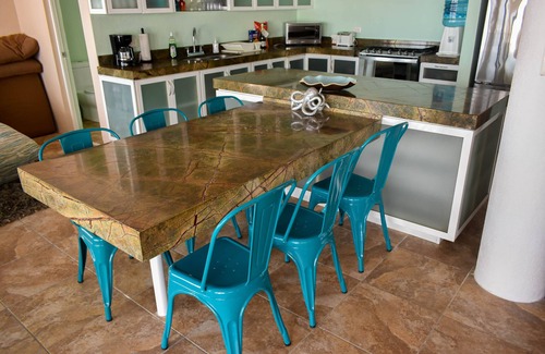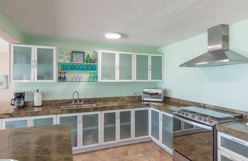 The interior is tastefully appointed with upscale furnishings, combining comfort and elegance. The two upstairs master suites feature private terraces and sweeping ocean views, each uniquely decorated to enhance your stay. One of the upstairs suites also includes a bathtub—a rare feature in Mexico. For added privacy, the attached casita offers a secluded suite with its own bathtub. Downstairs, you’ll find two additional bedrooms, each with ensuite bathrooms.