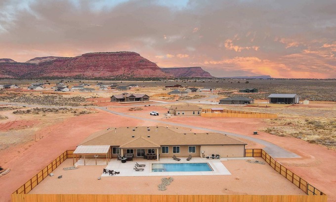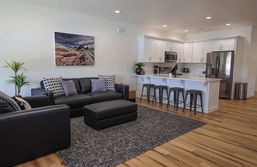 You've found your own desert oasis right here in Kanab. It's a terrific option for a large family, multiple families, or multiple couples/friends. There are 4 bedrooms and 4 bathrooms all on one level. All the Bedrooms have brand new king sized mattresses and 2 additional rollout beds are stored in the garage. Each bedroom is also equipped with its own smart TV. The kitchens are stocked with everything you need to prepare amazing meals. Coffee is provided via Keurig and K-cups. The great room has a large open floor plan with a 100 inch smart TV. The backyard is has privacy fencing all around, desert landscaping, patio, tables and plenty of outdoor seating, propane grill, fire pit, swimming pool and hot tub. Crimson Oasis in Kanab, Utah is the perfect place to stay because of it's proximity to the national parks and other attractions: Zion National Park (35 miles), Bryce Canyon National Park (81 miles), The Grand Canyon North Rim (84 miles) and the other wonders surrounding the area such as Peekaboo Slot Canyon (17 miles), Horseshoe Bend (73 miles), Lake Powell (68 miles), Antelope Canyon (70 miles) and Grand Staircase Escalante National Monument (12 miles). Book your Kanab adventure today!