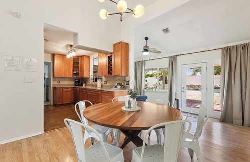 This cozy and well-appointed home comfortably hosts up to 4 guests, featuring 2 inviting bedrooms and 2 full bathrooms. The primary bedroom includes an en-suite bathroom for added privacy, while the second bedroom is perfect for additional guests or family members. The open-concept living area offers a comfy sofa, smart TV, and a dining area that flows into a fully equipped kitchen—ideal for home-cooked meals. You'll also enjoy high-speed Wi-Fi, in-unit laundry, and a peaceful outdoor patio or yard space for relaxing in the Arizona sunshine. Driveway and street parking are available for your convenience.