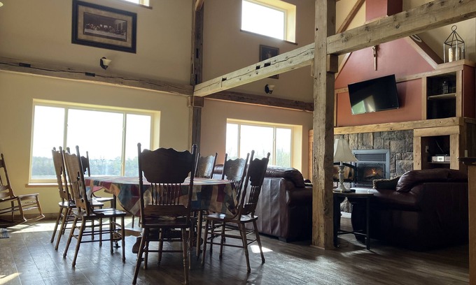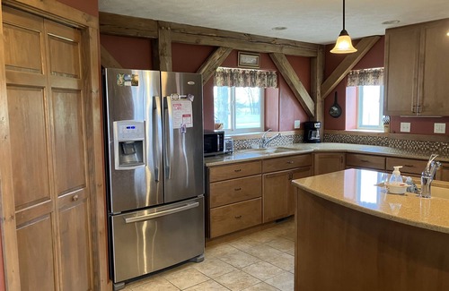 You will have the entire house to yourself. This timberframe home is 4,500 sq ft and was built on the top of a hill overlooking a valley and woods. It was built with reclaimed barn beams from one of my great Grandpa's barns and insulated concrete walls surrounding most of the house. The home has a whole house audio system with speakers in different locations on the upper level and main level. You can connect your own mp3 player or phone to play music in several rooms or use our CD player to play CDs from a large classical music collection.