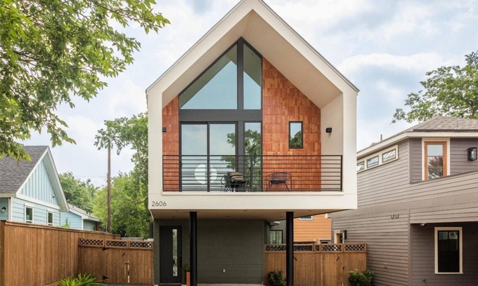 Enjoy the best of East Austin in this stunning home with a fresh design, soaring ceilings, views of downtown, and tons of natural light. Wait until you see this innovative floorplan offering two bedrooms each with an ensuite bathroom upstairs.