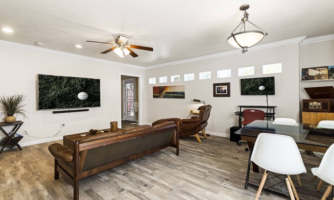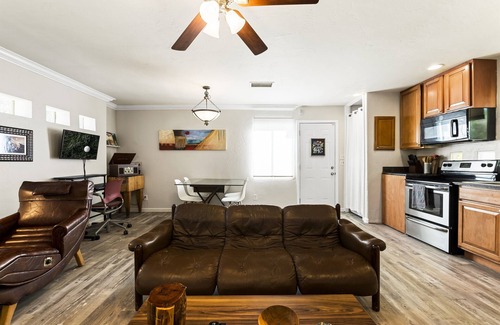 Enjoy this remodeled and completely private charming guest home with a modern comforts with fun, retro features. The Palo Verde Hideaway has its own private gated entrance, private back patio with sitting area and separate bedroom with comfy queen size bed with closet for additional storage, smart TV and door to private patio. The bathroom features a walk-in shower and the open kitchen/living space features new wood flooring, a full, well-stocked kitchen for cooking all your meals, dining area with seating for four, a large 70" flat screen smart tv equipped with Disney+, Netflix, YouTube live TV and other streaming channels. There is room for an air mattress so just let us know if you might need that for your stay and we will be sure it is there for you. Should you need to get a little work done during your stay? We have a dedicated office area and high-speed WiFi internet.