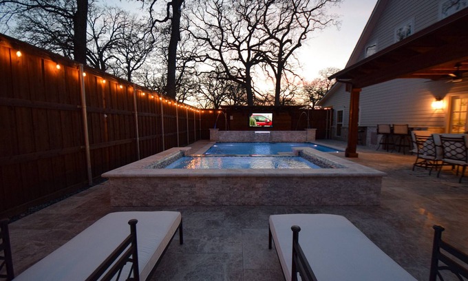 Explore Eagle Mountain Lake while staying in this luxury home away from home. There is something for everyone in this unique, family- friendly resort style home. Plenty of room for multiple families/friends to relax, play and make memories indoors and outdoors. The swimming pool and oversized spa will keep you busy. There is even an option to heat the pool or use the swim jet that is available. Lake access to bring a boat or just go fishing. Also down the road from one of the most popular hiking state parks. Both within a 1 mile. Quiet space cut out for those on business or needing to mix work and play. For a bit of fun off the water, head to a Ranger game, a Cowboys game, a concert at AA center or Dickies arena, a play at Bass Hall or maybe just explore the nightlife in the Stockyards or Downtown Ft. Worth. Most of these experiences within a 20-25 min drive. Stay at home to enjoy a little shuffleboard, cornhole or ping pong (coming soon).