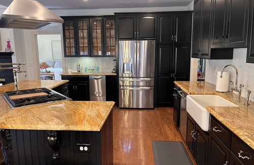 The kitchen is open to the breakfast room, family room, and sunroom. Complete with granite countertops, ceramic beadboard backsplash, cherry and glass-front cabinetry, and high-end appliances, including a Thermador gas cooktop with counter griddle, Rohl pot filler, and ceiling-mount ventilator, the space is both delightful and functional.