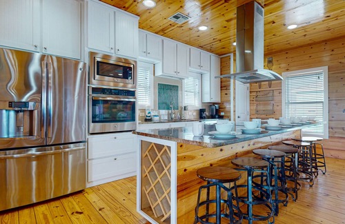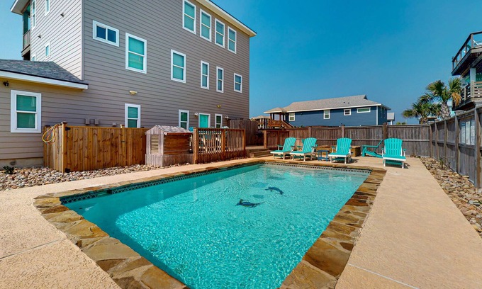 Centrally located in Port Aransas, All Waves No Worries is the perfect beach house getaway. Enjoy the breathtaking ocean view and indulge in some luxury with the private pool, fire pit, two decks and included golf cart. This incredible home features two living areas, a fully equipped kitchen with stainless steel appliances and an oversized dining table with additional seating for 6 at the kitchen bar. There's also a mini kitchen located on the 2nd floor. With plenty of space and amenities to accommodate your friends and family, All Waves No Worries is the perfect place for your next vacation or getaway.
